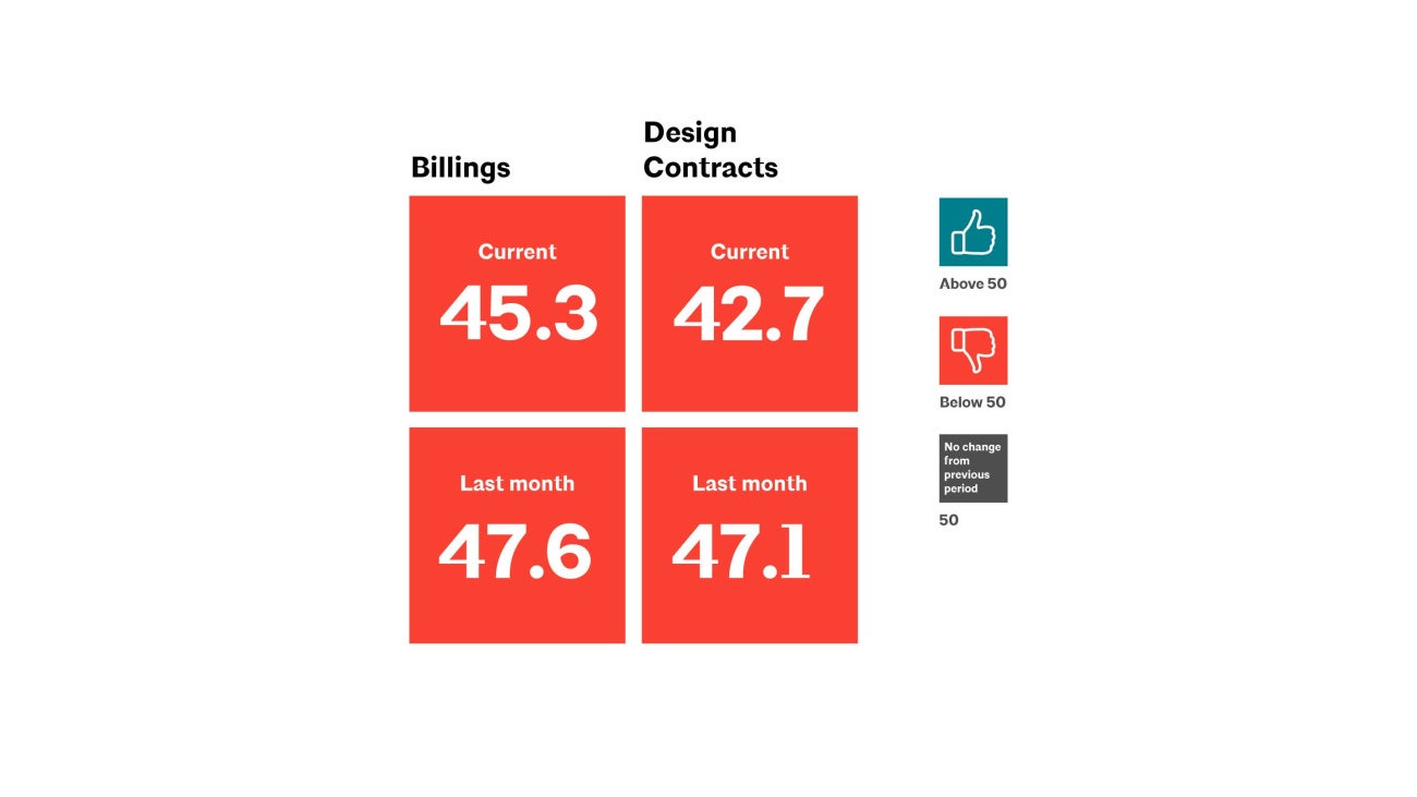 The AIA/Deltek Architecture Billings Index® (ABI) score for the month remained well below the 50 level at 45.3 (a score over 50 indicates billings growth). This marked the 13th consecutive month of declining billings at architecture firms, and the 35th month of a score below 50 out of the last 38. Inquiries into new projects only increased modestly this month, and the value of newly signed design contracts continued to soften. Until work in the pipeline starts to pick back up, firms are unlikely to see a significant increase in their billings.